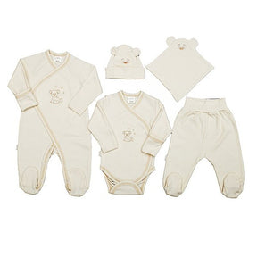 Riietus koosneb soojast ja pehmest OEKOTEX-sertifikaadiga puuvillasest mütsist, kampsunist, kombinesoonist, pükstest ja magamisasemest. Pakendatud kaunisse karpi – ideaalne kinkimiseks või sünnitusmajja viimiseks esimese beebiriietena.