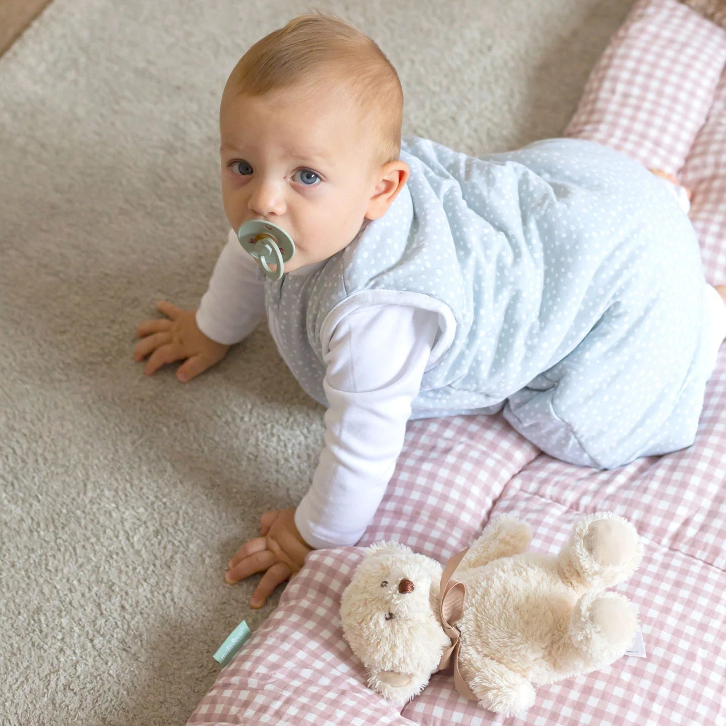 - Alates 3 kuu vanusest küljel on ere värviskeem koos 3D-illustratsioonidega intensiivseks visuaalseks stimulatsiooniks - vanemad saavad seda värvilist külge kasutada, et hoida beebi kauem kaasas ja keskenduda - eriti kasulik, kui väike uurija lamab kõhuli - see tugevdab beebi kaela- ja õlalihased. Tasku, närimine ja erinevad tekstuurid ja detailid soodustavad puudutust ja arendavad peenmotoorikat.