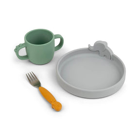 Komplekti kuuluvad: libisemisvastase põhjaga taldrik, libisemisvastase põhjaga tass ja kahvel.