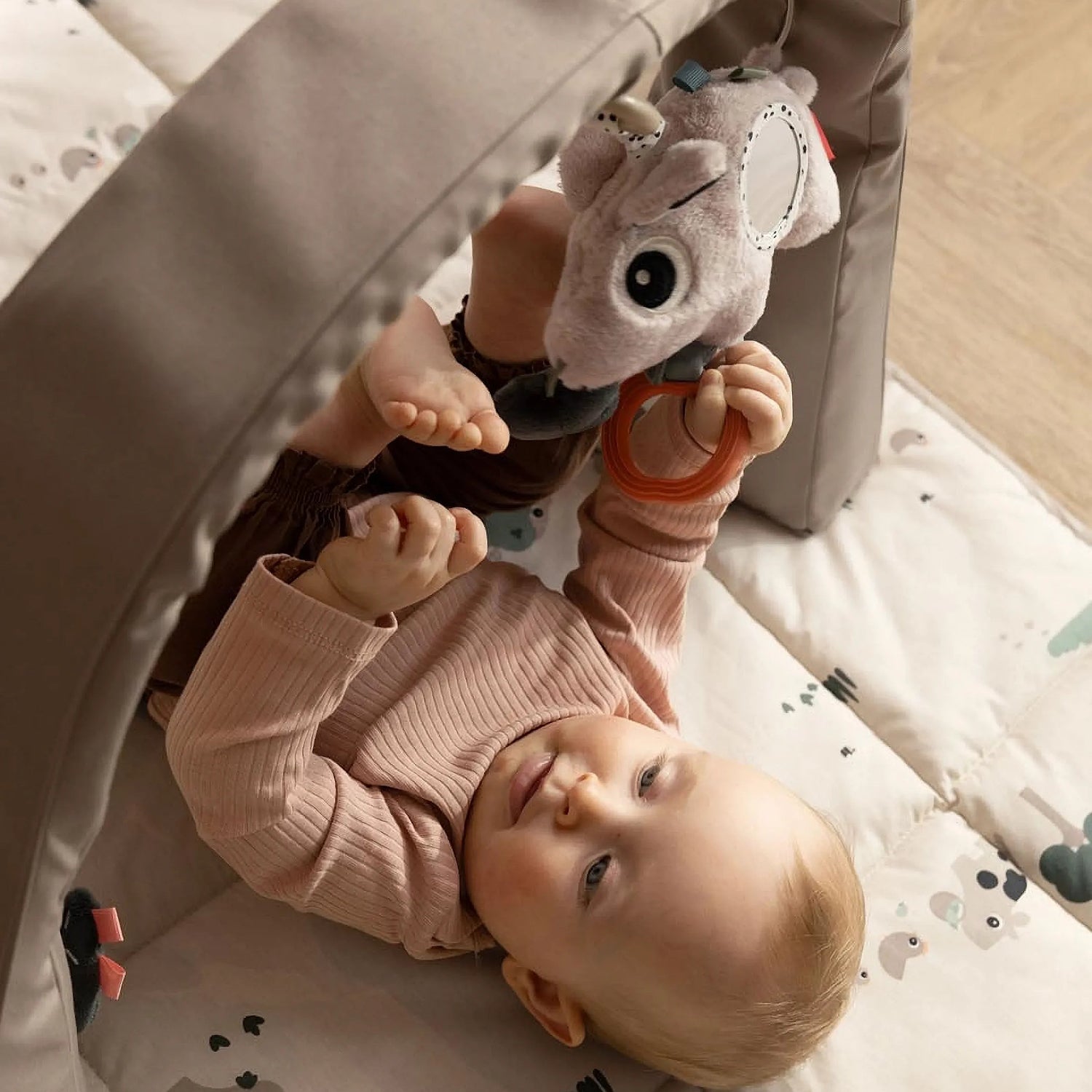 Tegevusrõngas innustab beebisid olema uudishimulik ja uurima sensoorseid omadusi – pehme närimine igemete sügeluse leevendamiseks, kõristiga peegel, pehme tekstuuriga mänguasi ja lõbusad helid. Mänguasja on lihtne väikeste sõrmedega haarata ja hoida ning elastne aas mahutab luti või muu mänguasja. Kasutage mänguasja rõnga kinnitamiseks mängumati külge, kinnitage vankri, võrevoodi, söögitooli külge - lihtne selga panna ja ühest kohast teise teisaldada - lõbustab ja hõivab väikest nii kodus kui autos või jalutuskäikude ajal.