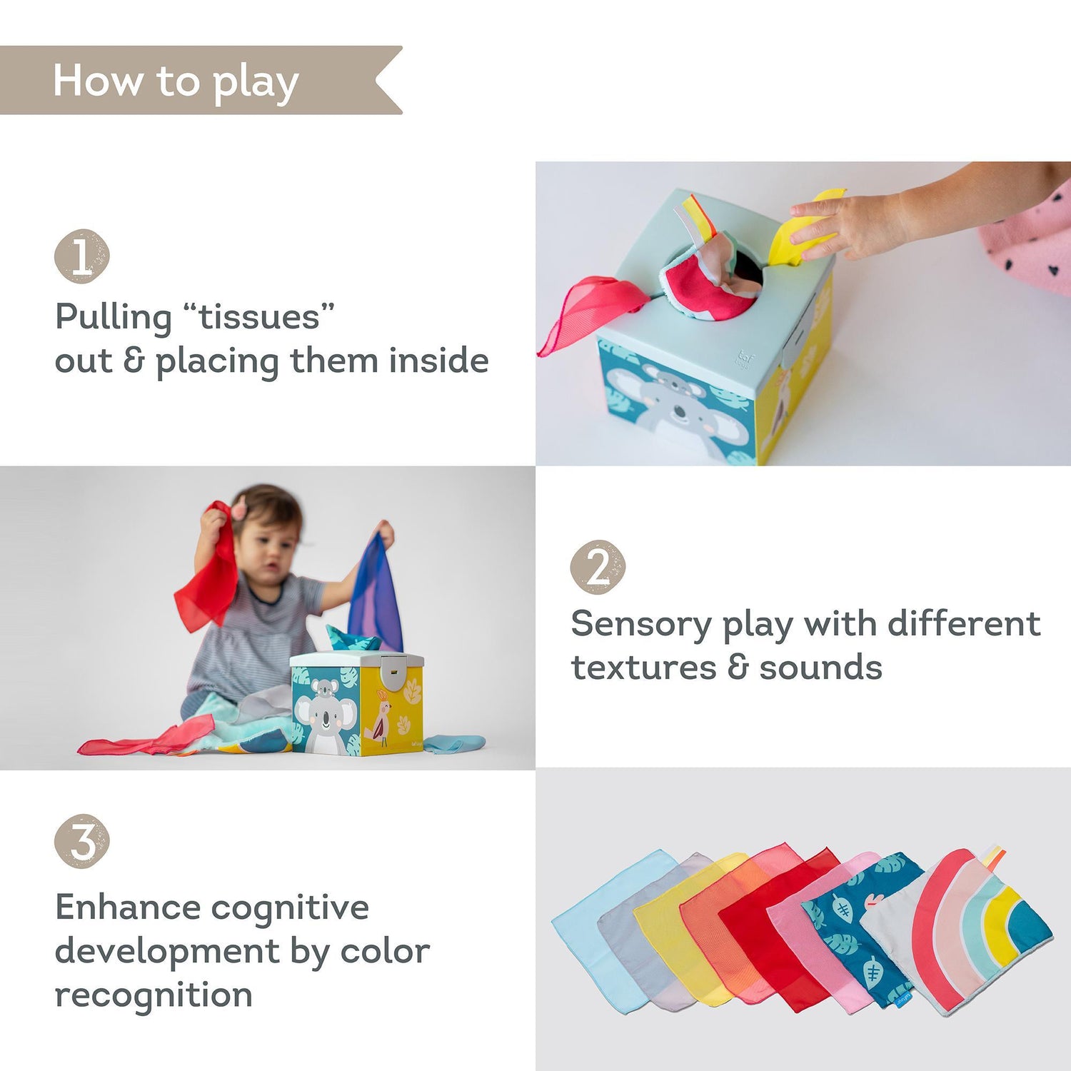 2. Alates 3 kuu vanusest küljel on ere värviskeem koos 3D-illustratsioonidega intensiivseks visuaalseks stimulatsiooniks - vanemad saavad seda värvilist külge kasutada, et hoida beebi kauem kaasas ja keskenduda - eriti kasulik, kui väike uurija lamab kõhuli - see tugevdab beebi kaela- ja õlalihased. Tasku, närimine ja erinevad tekstuurid ja detailid soodustavad puudutust ja arendavad peenmotoorikat.