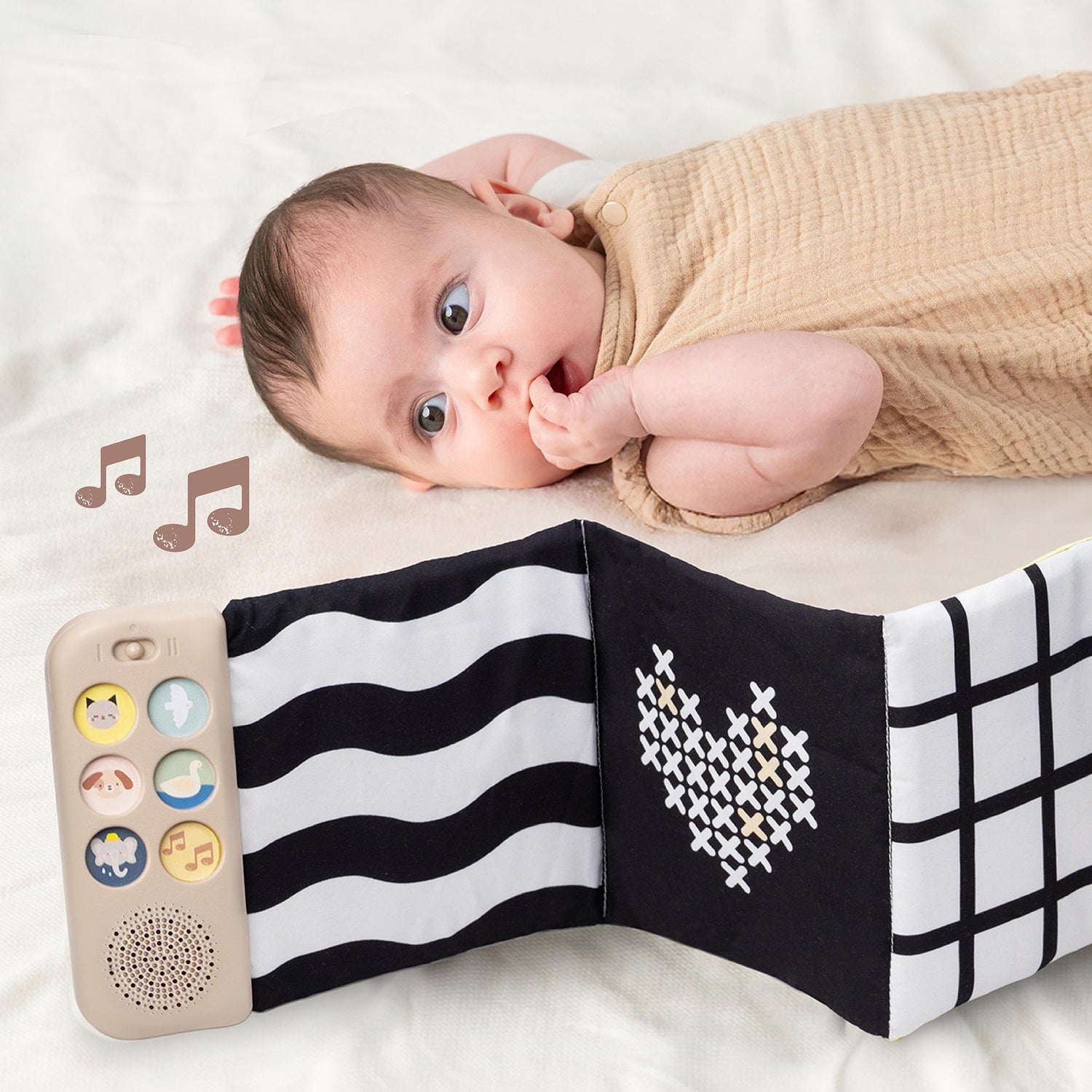• minkšti, kūdikiui saugūs tekstiliniai audiniai • aukštos kokybės sensorinės medžiagos • saugūs plastikiniai mygtukai