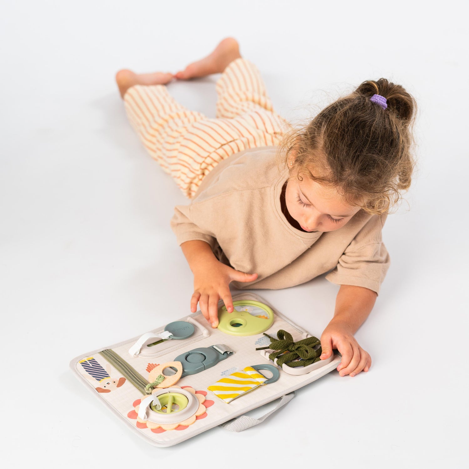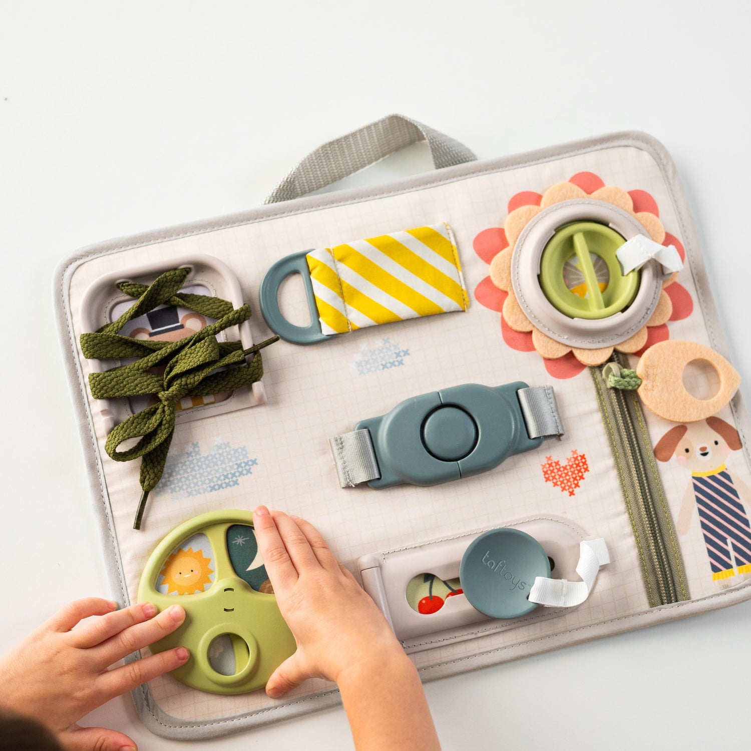 - Alates 3 kuu vanusest küljel on ere värviskeem koos 3D-illustratsioonidega intensiivseks visuaalseks stimulatsiooniks - vanemad saavad seda värvilist külge kasutada, et hoida beebi kauem kaasas ja keskenduda - eriti kasulik, kui väike uurija lamab kõhuli - see tugevdab beebi kaela- ja õlalihased. Tasku, närimine ja erinevad tekstuurid ja detailid soodustavad puudutust ja arendavad peenmotoorikat.